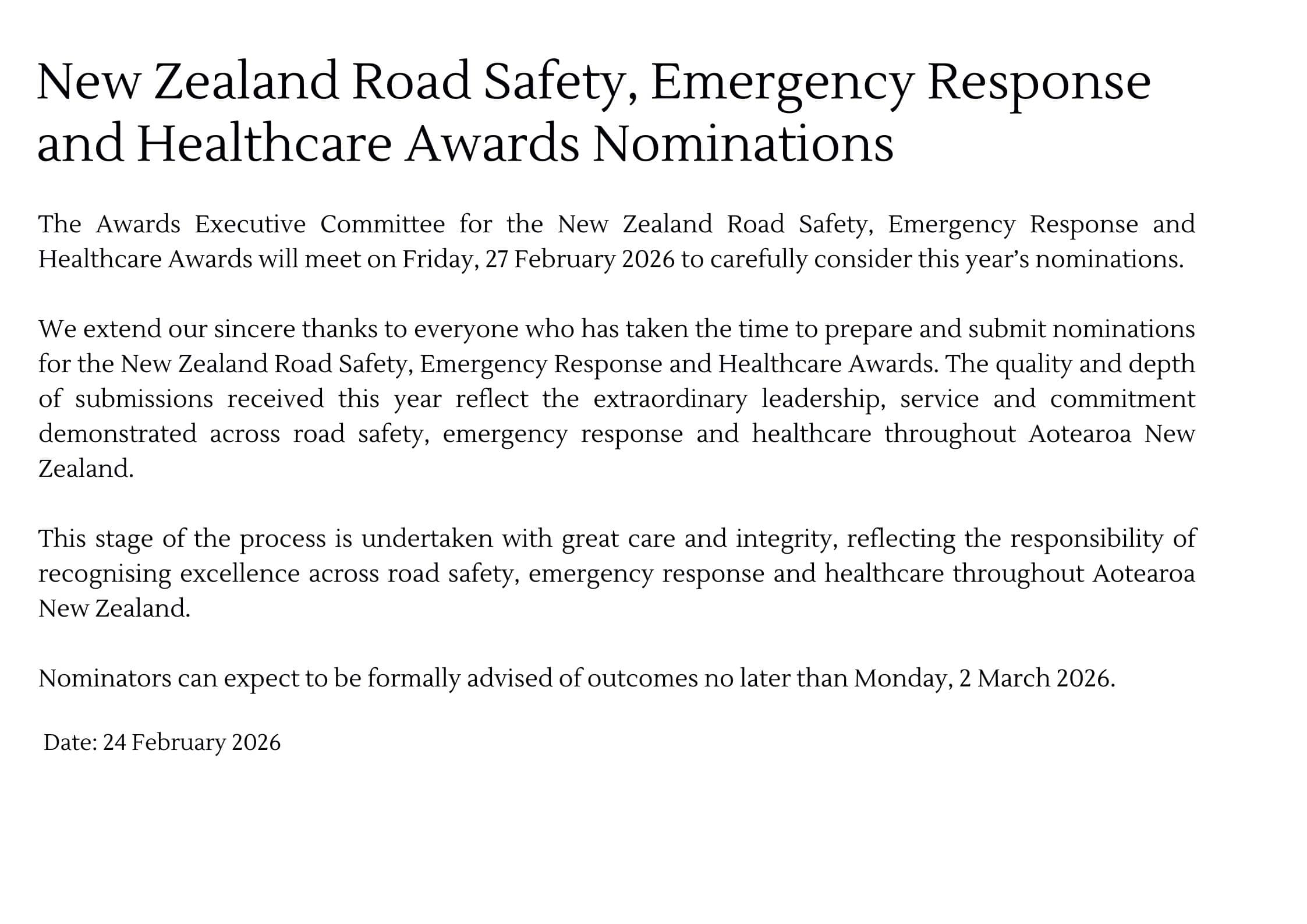 NEW ZEALAND ROAD SAFETY, EMERGENCY RESPONSE AND HEALTHCARE AWARDS EXECUTIVE COMMITTEE