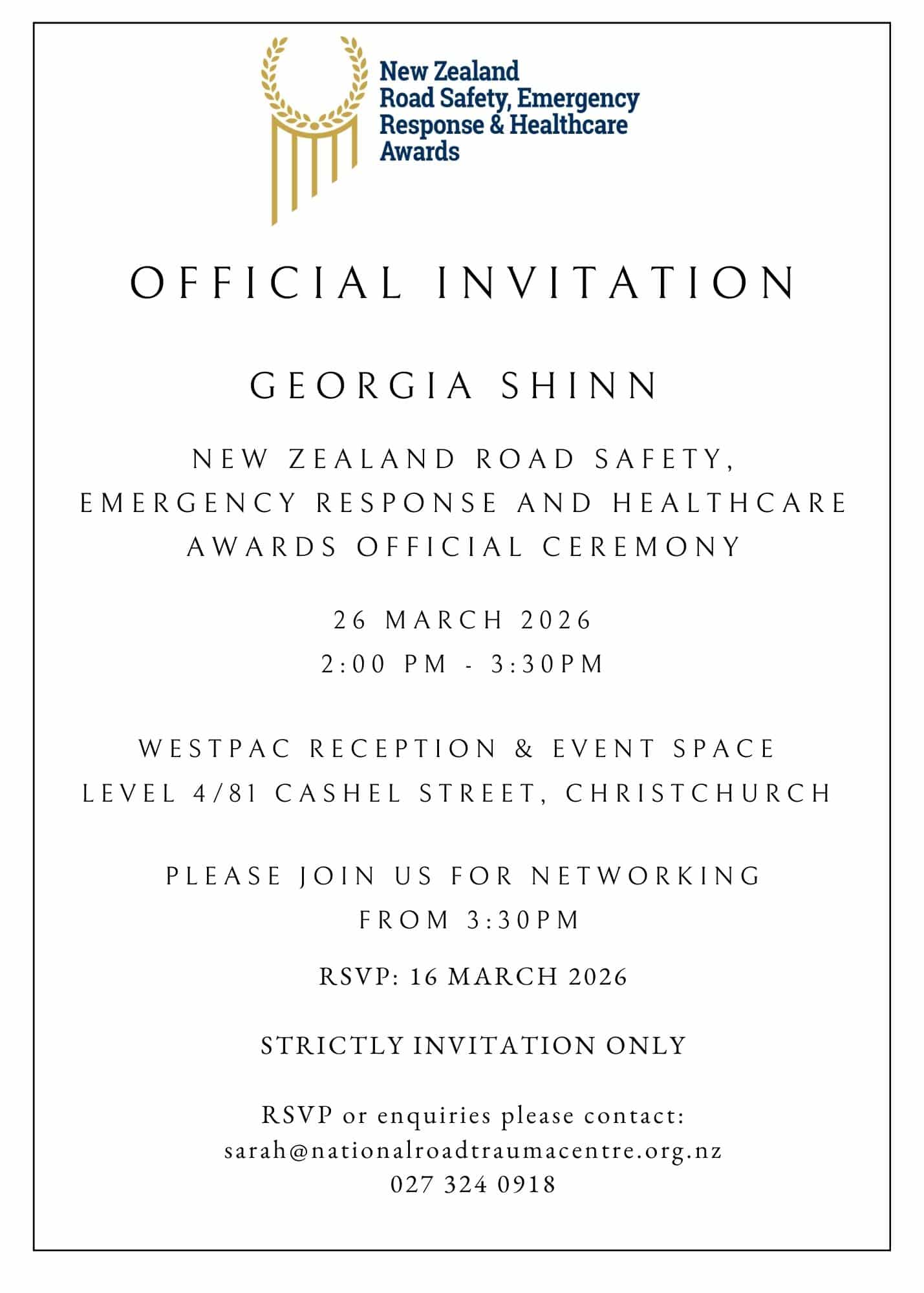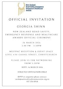 Georgia Shinn New Zealand Road Safety Emergency Response and Healthcare Awards Official Invitation
